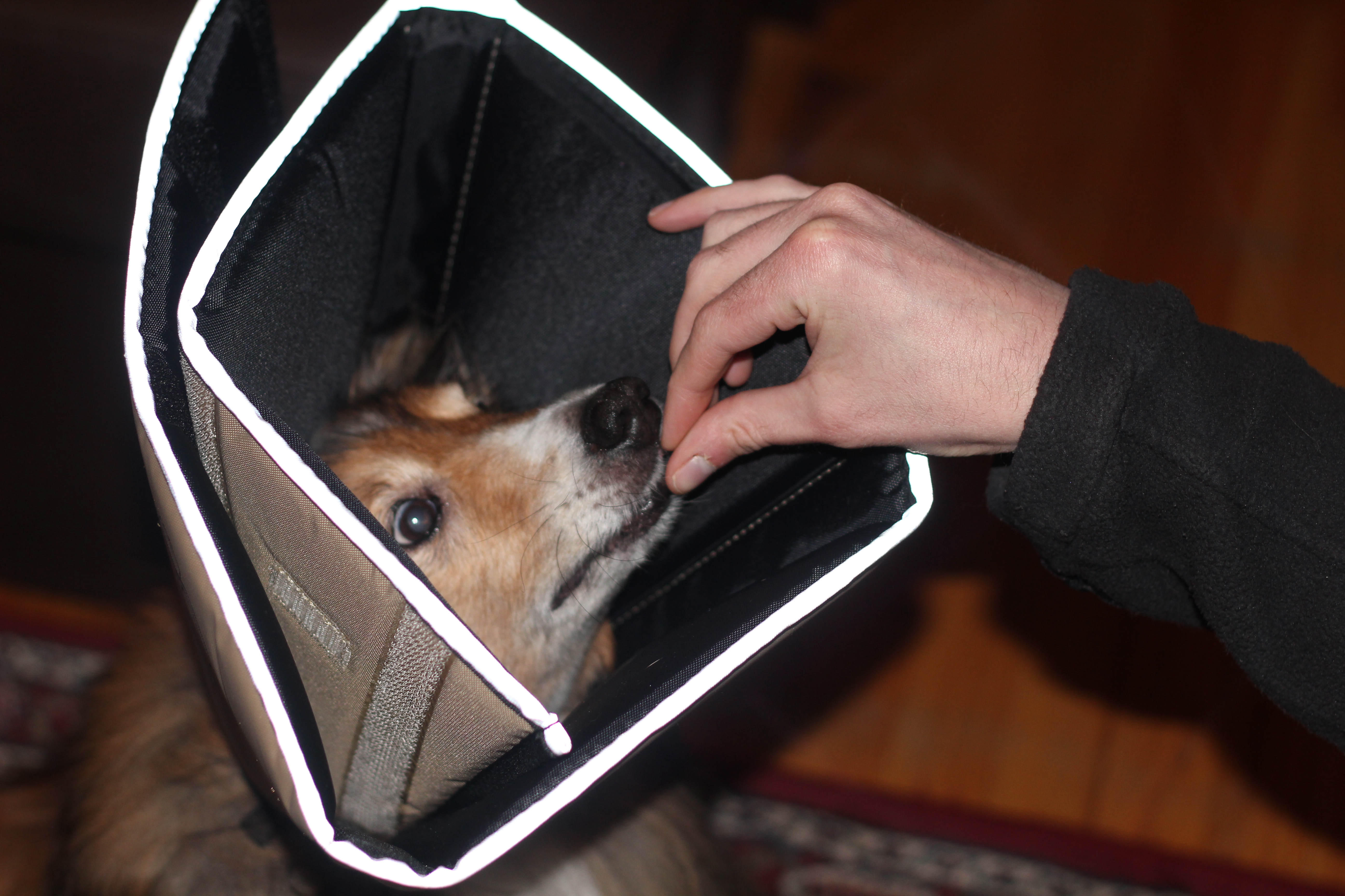 Our precious little Biscuit came through surgery today with no unexpected surprises.  His small mass was removed and was sent to the lab for biopsy, and we should receive the results next week.  His teeth have been cleaned and look very white!  No tooth extractions were necessary per the exam and dental x-rays.  The x-rays confirmed that Biscuit does have arthritis in his front paws.  Biscuit will be on antibiotics and a pain-killer for the next week, in addition to taking the medicine to lower his urine protein levels.  Biscuit, at his next check up, may be placed on medicine or receive special treatments for his arthritis after he recovers from his surgery.  Biscuit, unfortunately, will be wearing a Comfy Cone as shown below for the next two weeks until his stitches are removed.  All in all, Biscuit  is doing pretty well with the large size Comfy Cone — he is learning to maneuver his way around.  He is still giving us his paw for more kibble!  We are very happy that Biscuit made it through surgery with no complications, and hope that he has a smooth recovery.