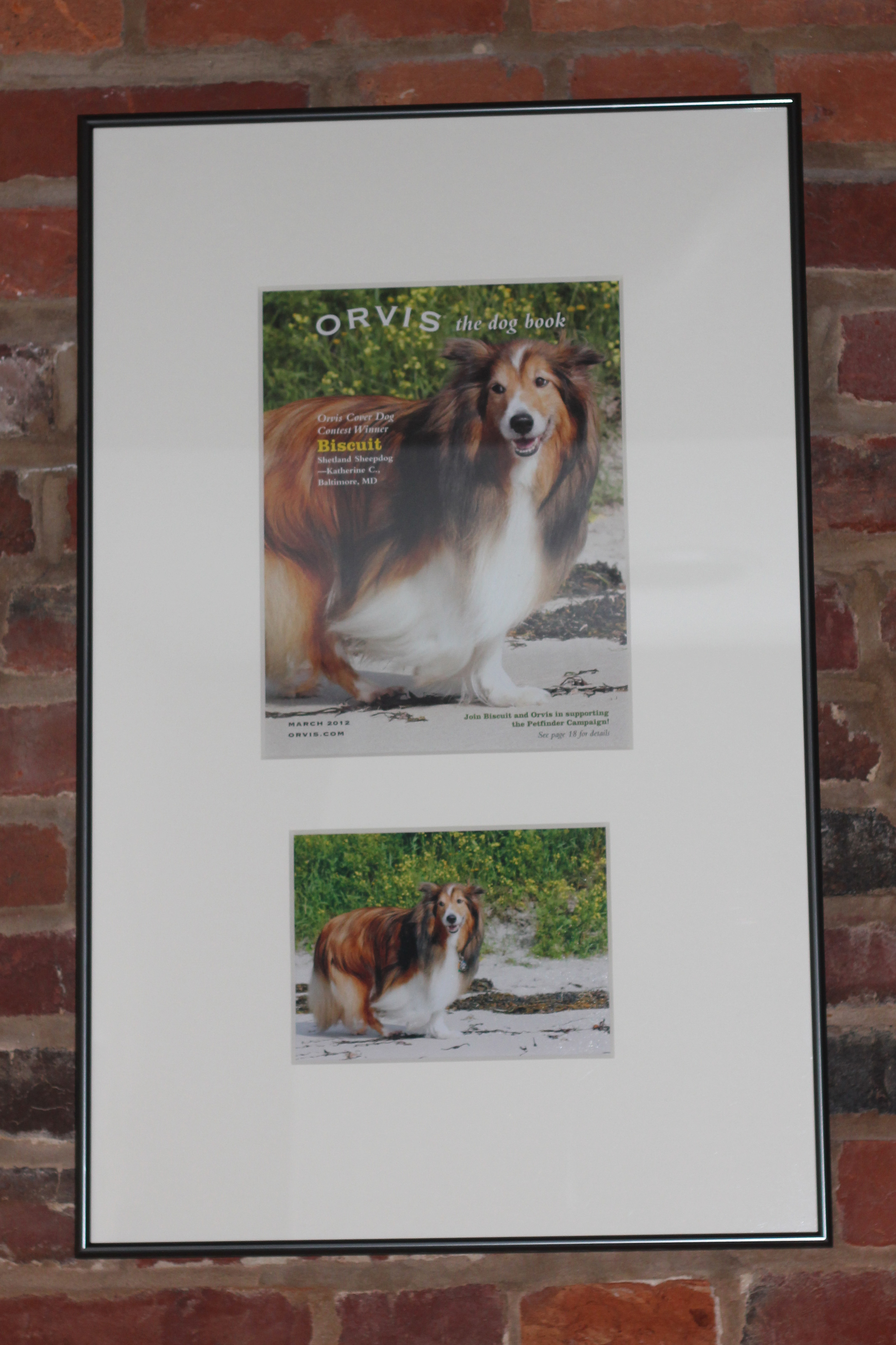 Doug and I just received Biscuit’s framed Orvis Cover Dog image along with the original photograph of Biscuit! We are very pleased with the results. We used James L. Pierce Fine Art and Custom Framing Galleries located in Baltimore. Now, Biscuit will forever be in our home marking his monumental day!
