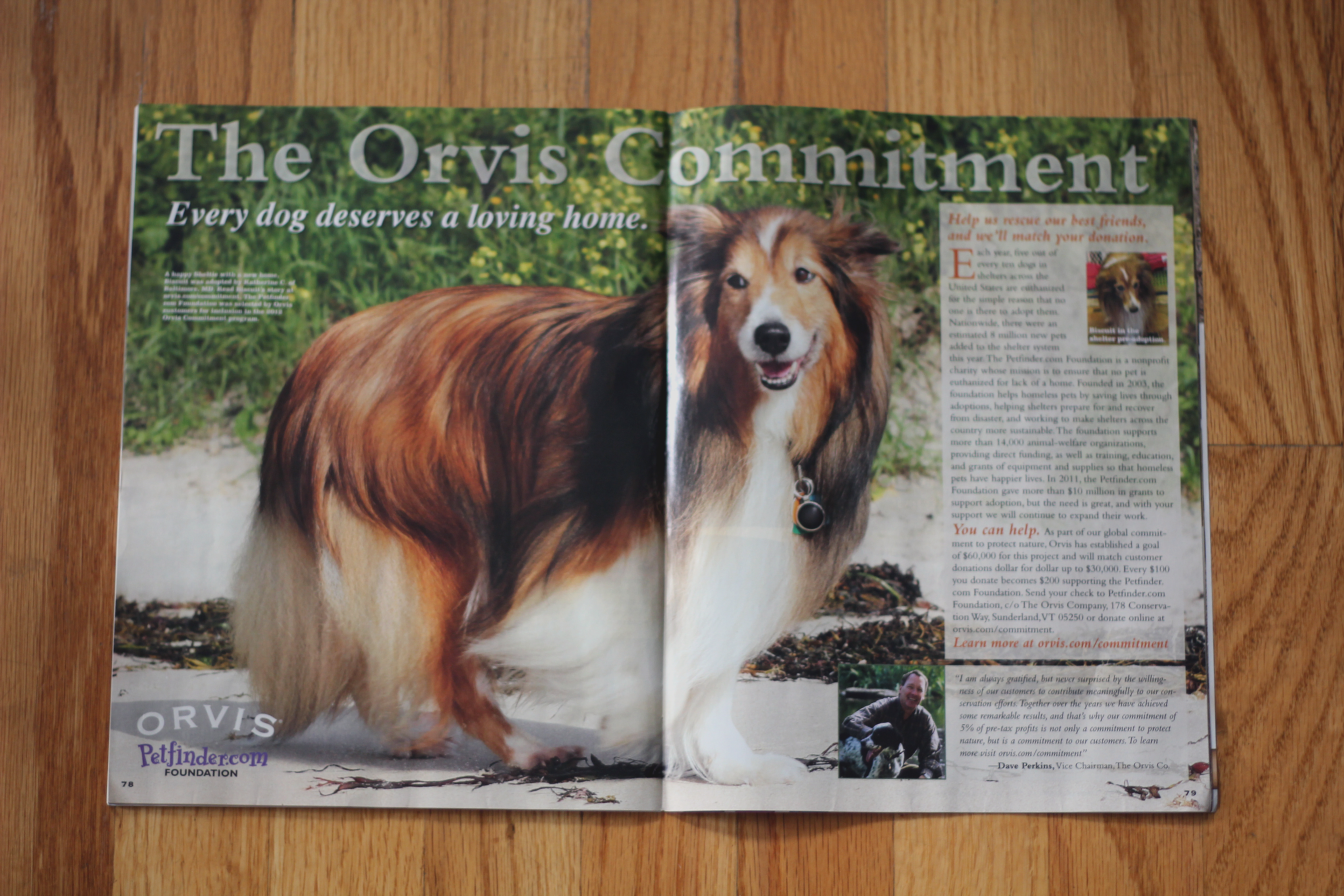 Biscuit is featured in the Orvis Gift Book as a centerfold promoting dog rescue via the Orvis Petfinder.com Commitment. Please see the photographs of little Biscuit below!