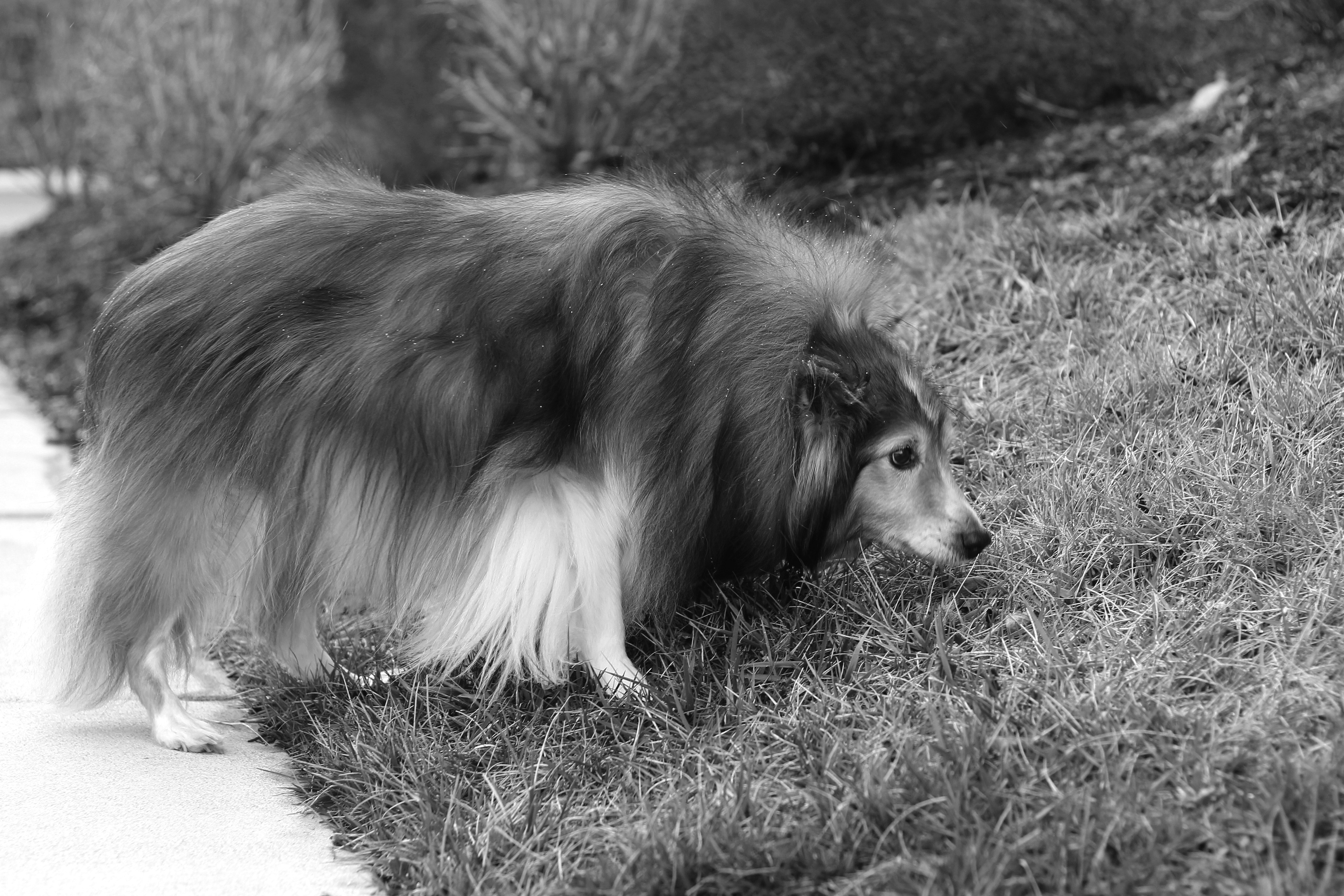Below is a photograph of little Biscuit sniffing around just as it began snowing. If you look closely, you can see some of the small snowflakes on Biscuit’s fur coat!
