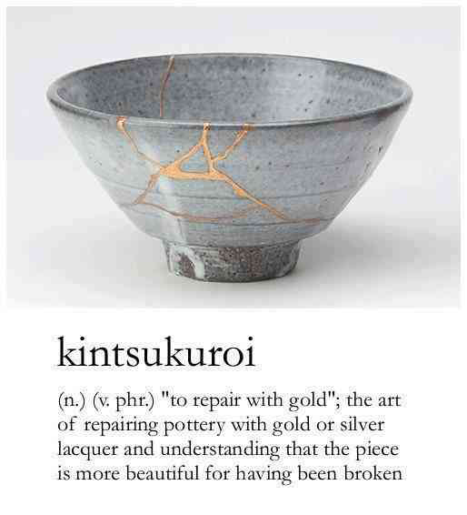 Additionally, the book entitled, Broken Open: How Difficult Times Help Us Grow, by Elizabeth Lesser, is a good read in line with the concept of Japanese art of kintsukuroi.
