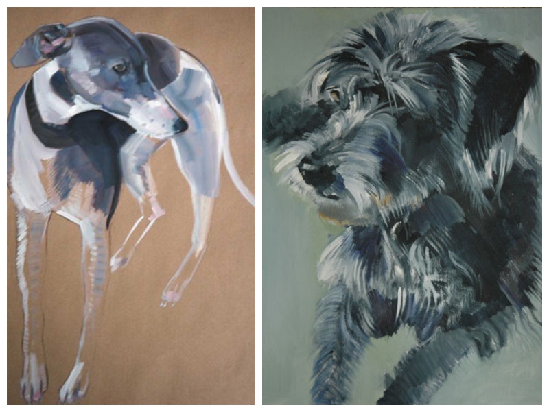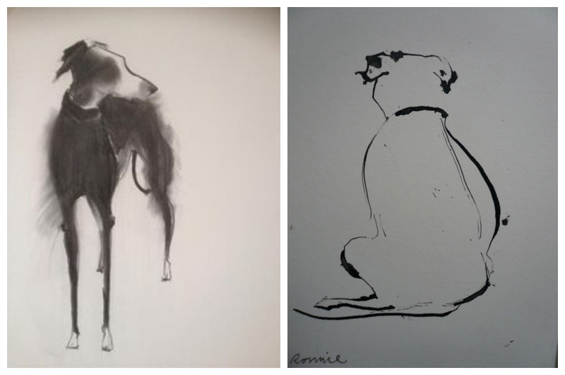 SALLY MUIR: At art school I painted my children over and over again, occasionally our dogs would appear in these paintings, and gradually the dogs took over. Then I began to paint and draw dogs more than people, although I do still paint people and landscapes as well, dogs have been dominating for the last few years.