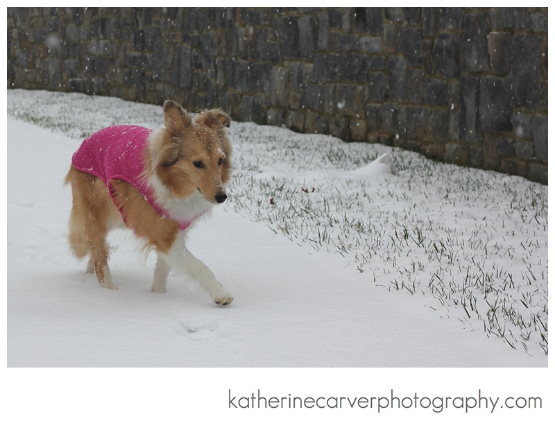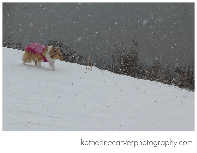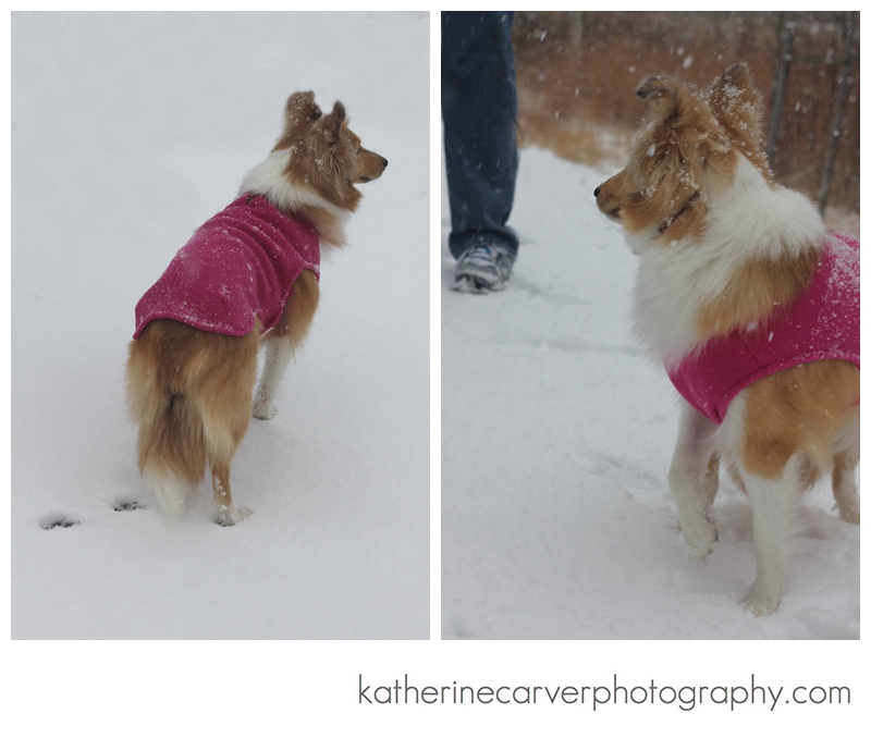 This past weekend was our first snow with our little Victory! Victory had a good time in the snow! She wore her new pink fleece from her Grandma and Grandpa to keep her warm and to protect her little sheltie furs! (We might have to find some matching little pink boots and see if Victory will tolerate wearing them!) While we were outside in the snow, Victory put her little snout in the snow many times to sniff around and she also licked the snow!