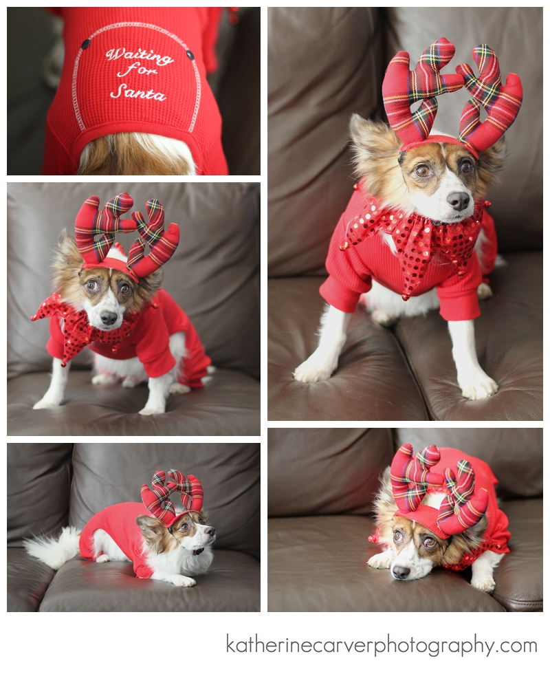Over Thanksgiving, I had fun photographing Victory and Nick, my parents’ furry family member, sporting their Christmas attire!  While we were out and about shopping, we found Nick the cutest long john material pjs, stating, “Waiting for Santa” on the bum!  Unfortunately, the company does not make one in a large enough size for Victory — otherwise, I would have purchased one for her!