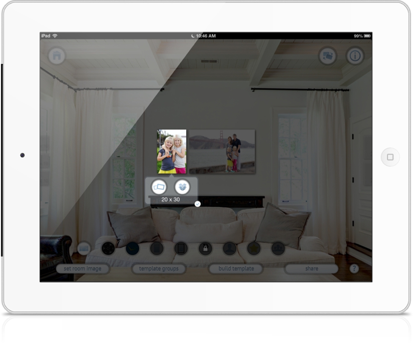 Doug and I have just about finished hanging all of our art and photographs on the walls of our new home. However, there is still space to hang more images and art in our home! I came across this neat program, Preveal, an ipad app. As shown below, Preveal allows you to take a photo of your living room, bedroom, or any room in your home — wherever you would like to hang your images and display accurately sized renditions of various wall displays! I am very visual, and this app makes it easy to see what a framed image will look like prior to actually hanging it!