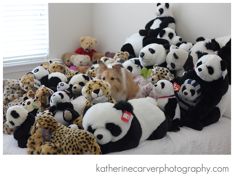 Anyone who has been to our home knows that we have a menagerie of “friends” (stuffed cheetahs and pandas) who have taken over our guest room!  We have more “friends” than we know what to do with, and they are all not pictured in the photo below — there are even more friends!  Our entire guest room has so many “friends” all of whom have names (although we forget their names at times)!  Buddy, not pictured, is our most recent “friend” addition!   (The pandas out number the cheetahs!)