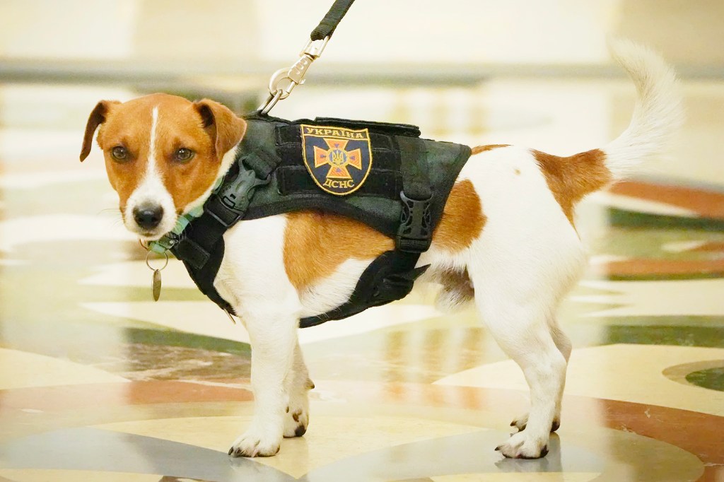 Patron poses at an award ceremony in Kyiv, Ukraine on Sunday. The Jack Russell terrier is credited with detecting more than 200 Russian explosive devices since the start of the war. Photo Credit: Efrem Lukatsky/AP.