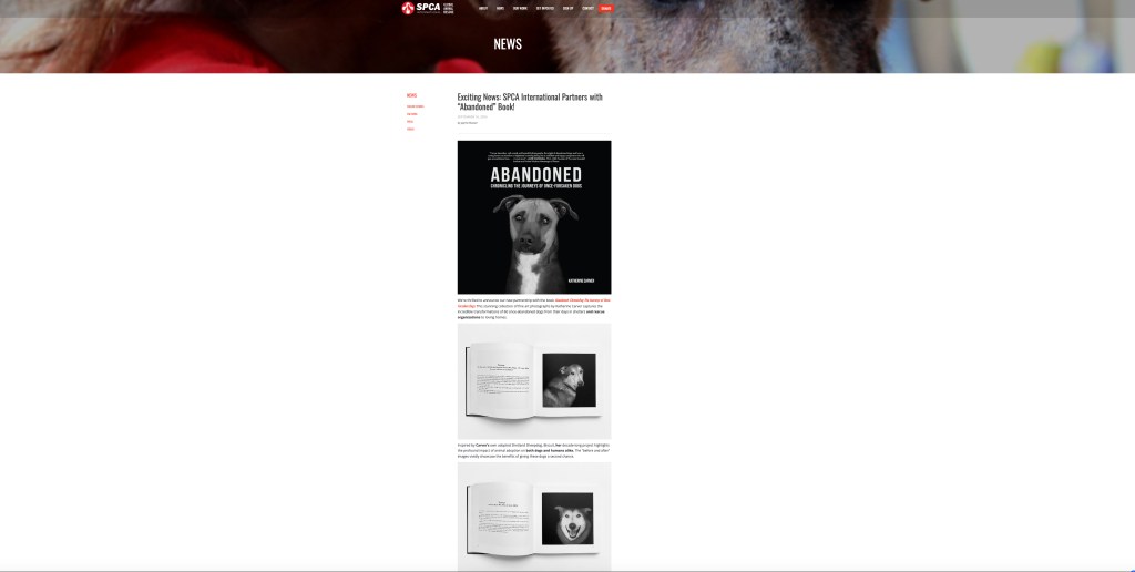 I am excited to announce that the I am donating a portion of my royalties, earned from the sales of ABANDONED: Chronicling the Journeys of Once-Forsaken Dogs, released on October 1, 2024, to the SPCA International, helping dogs in need around the globe, giving back to the important cause! You can read more here and here.