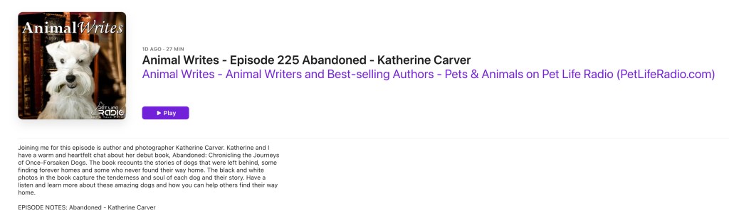 This fall, I had the opportunity to speak with Tim Link, the host of the show, Animal Writes on Pet Life Radio, where she asked thoughtful and insightful questions about my new book: ABANDONED: Chronicling the Journeys of Once-Forsaken Dogs. You can listen to the episode on Apple Podcast.