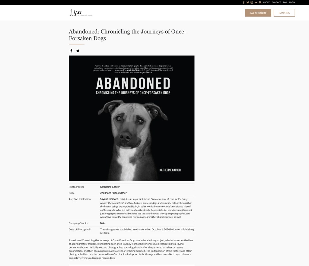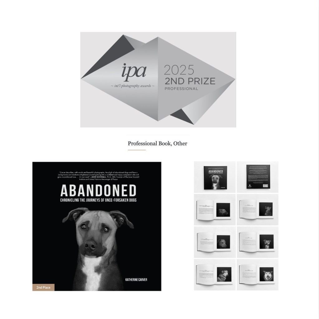 My first book, ABANDONED: Chronicling the Journeys of Once-Forsaken Dogs, earlier this week, received an International Photography Award, Second Place, in the Professional Book, Other category! You can view ABANDONED on the International Photography Award site here.