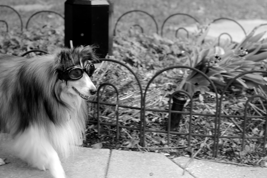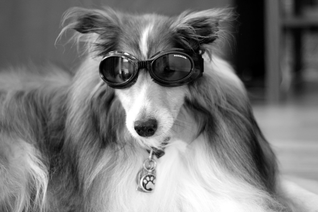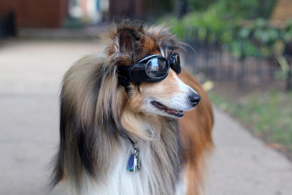 We recently received Biscuit’s Doggles in the mail! He actually does not mind wearing them! We will have to try out his new Doggles while he is riding in his Hound About! Below are some recent photographs of our little Biscuit wearing his new Doggles!