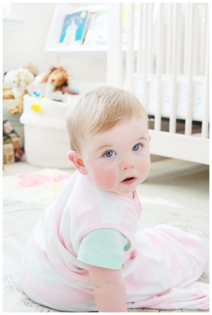 -she is sleeping well in her crib in her sleep sack, while still getting up one time a night to eat most nights — we hope to get her sleeping through the night soon!